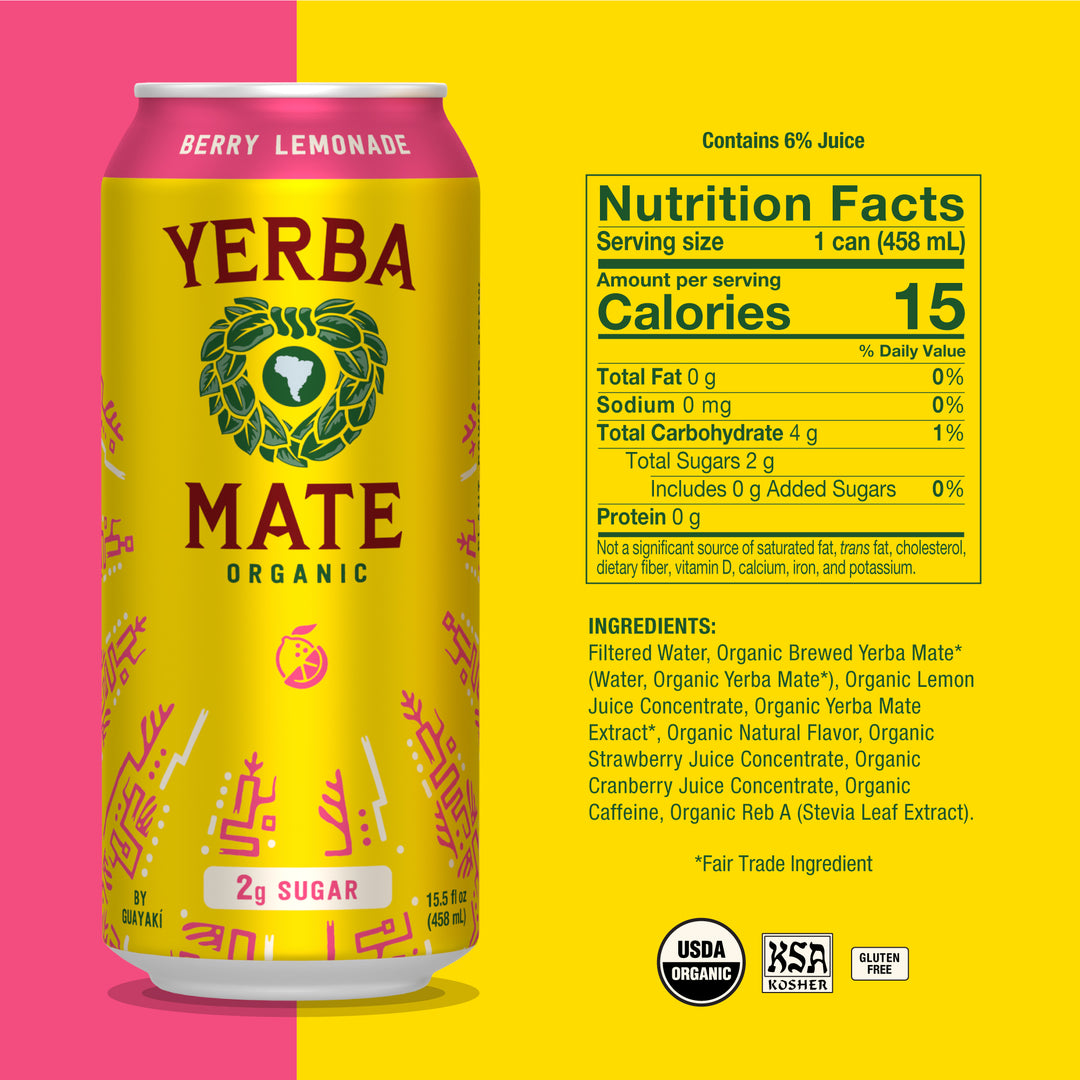 - Organic brewed yerba mate* (water, organic yerba mate*)