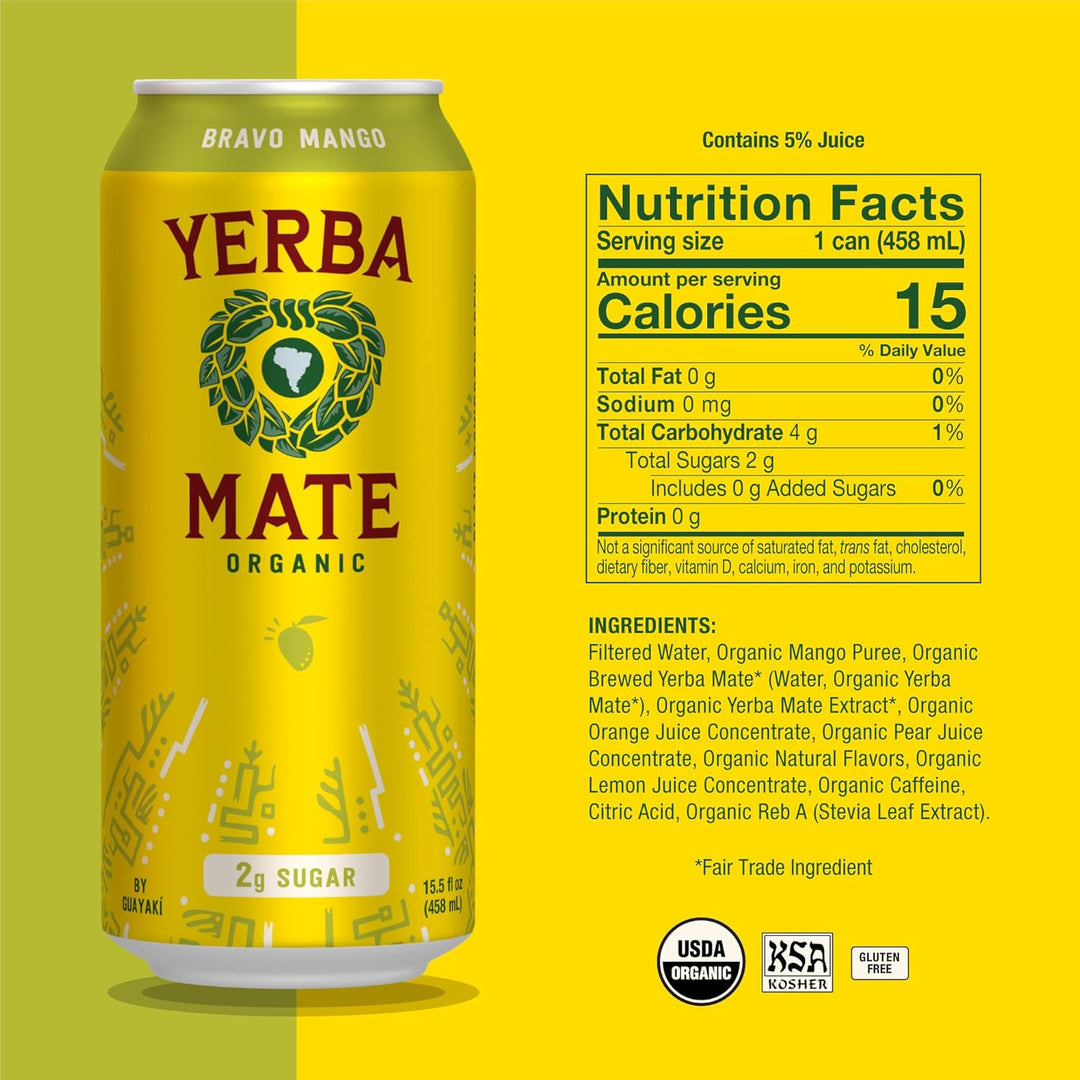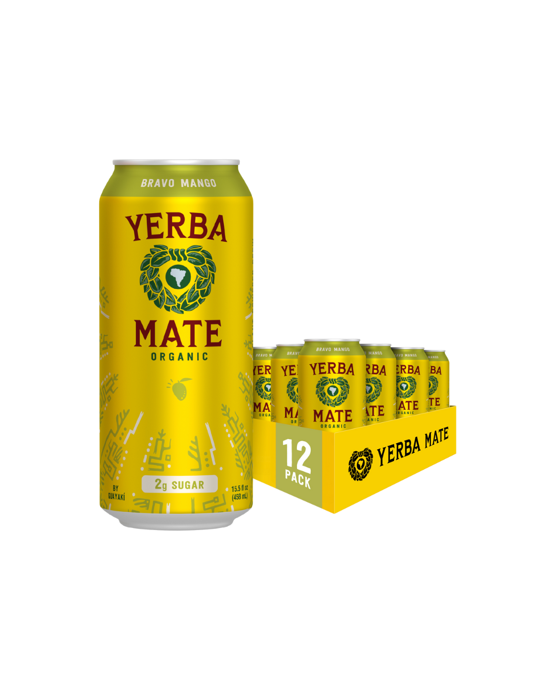 Ready-to-drink, without any added sugar, organic mango yerba mate beverage - caffeinated, certified organic and made with select fair trade ingredients.