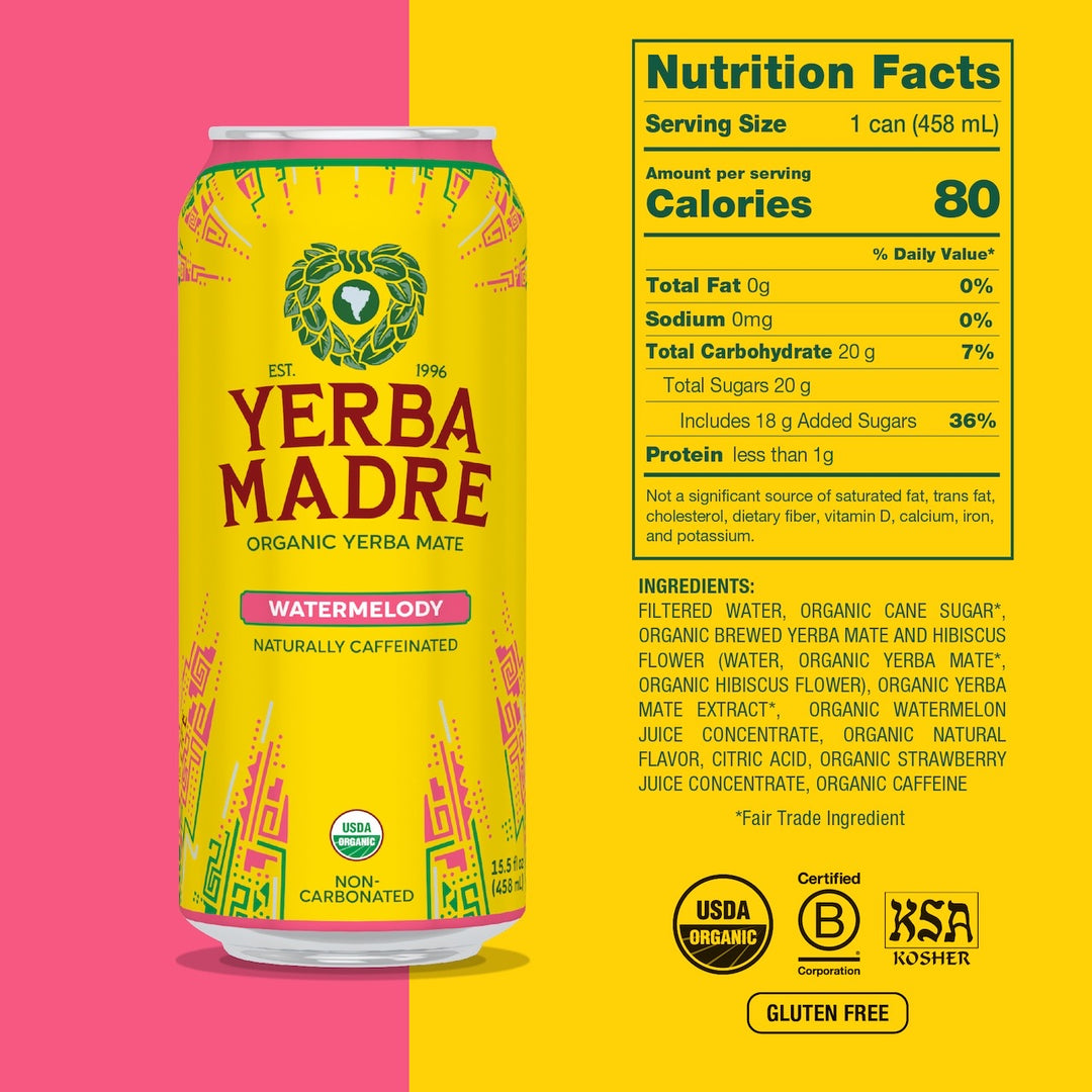 FILTERED WATER, ORGANIC CANE SUGAR*, ORGANIC BREWED YERBA MATE AND HIBISCUS FLOWER (WATER, ORGANIC YERBA MATE*, ORGANIC HIBISCUS FLOWER), ORGANIC YERBA MATE EXTRACT*, ORGANIC WATERMELON JUICE CONCENTRATE, ORGANIC NATURAL FLAVOR, CITRIC ACID, ORGANIC STRAWBERRY JUICE CONCENTRATE, ORGANIC CAFFEINE. 150 MG OF CAFFEINE PER CAN. Not recommended for children, pregnant or nursing women, or those sensitive to caffeine CAN *Fair Trade Ingredient