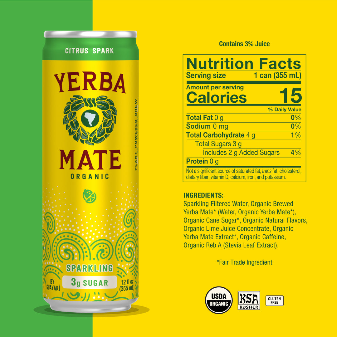 - organic brewed yerba mate* (purified water, organic yerba mate*)